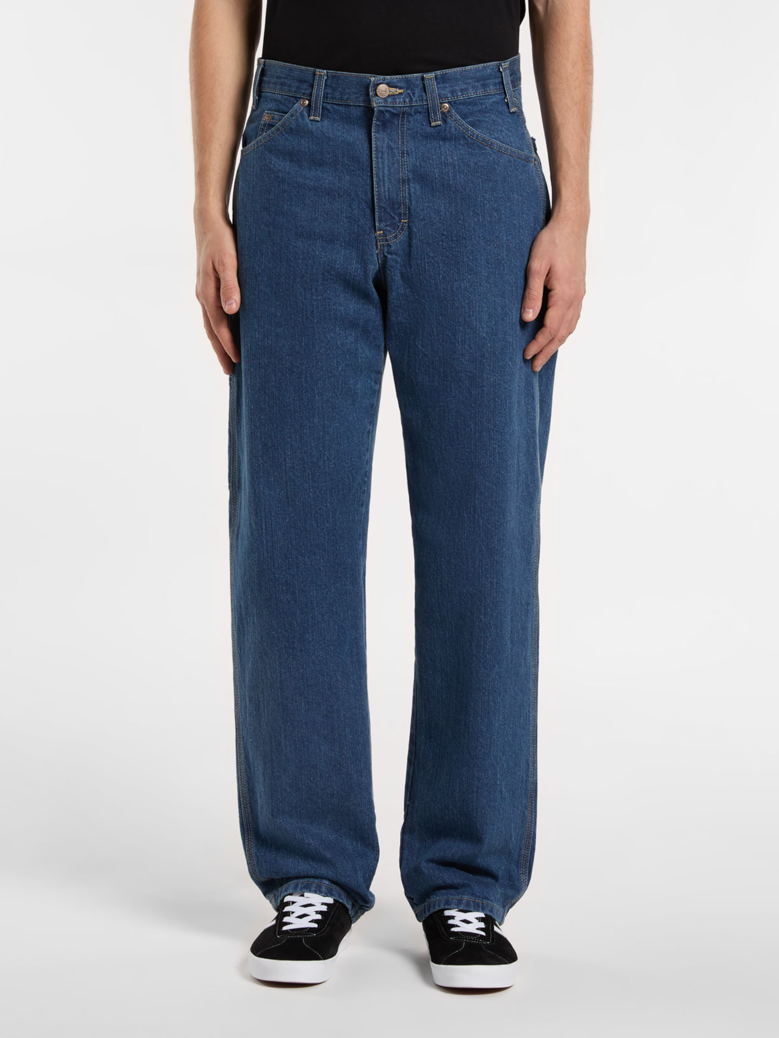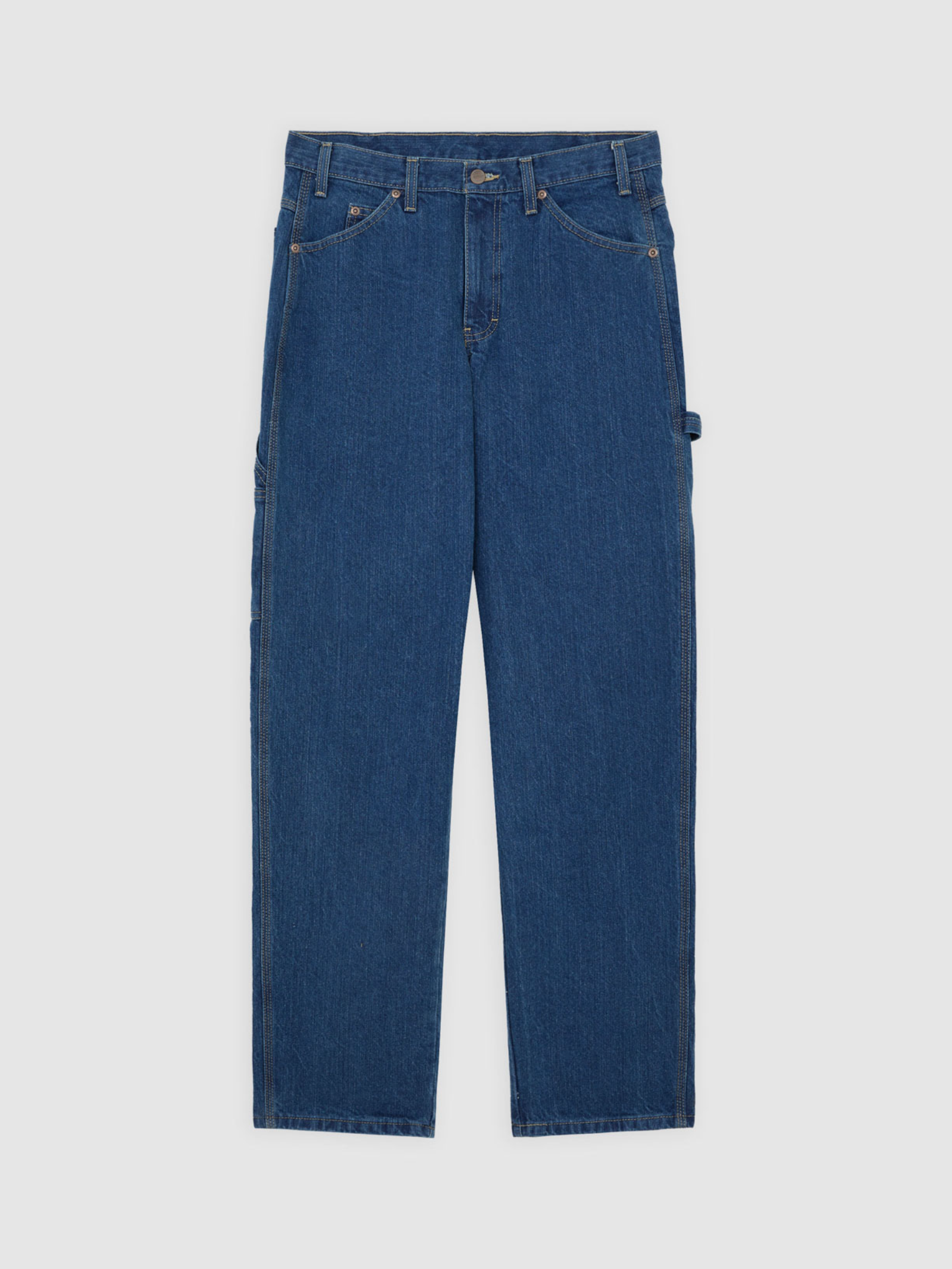 The 1993 Denim Utility Jeans by Dickies combines rugged durability with a utilitarian design. Made from sturdy cotton denim, it features reinforced front patches, triple seams, a brass zipper, and a hammer loop for workwear-ready construction.
