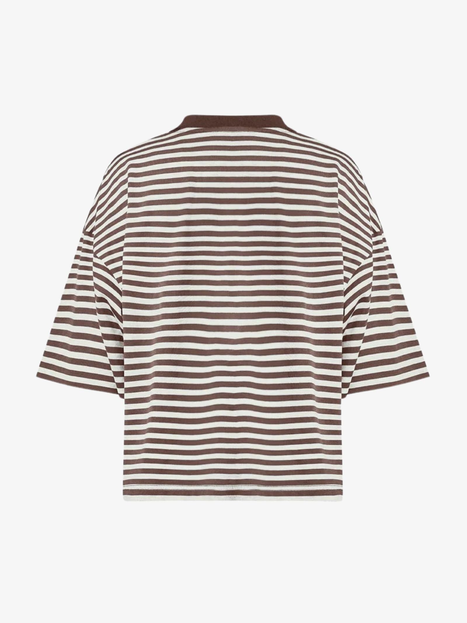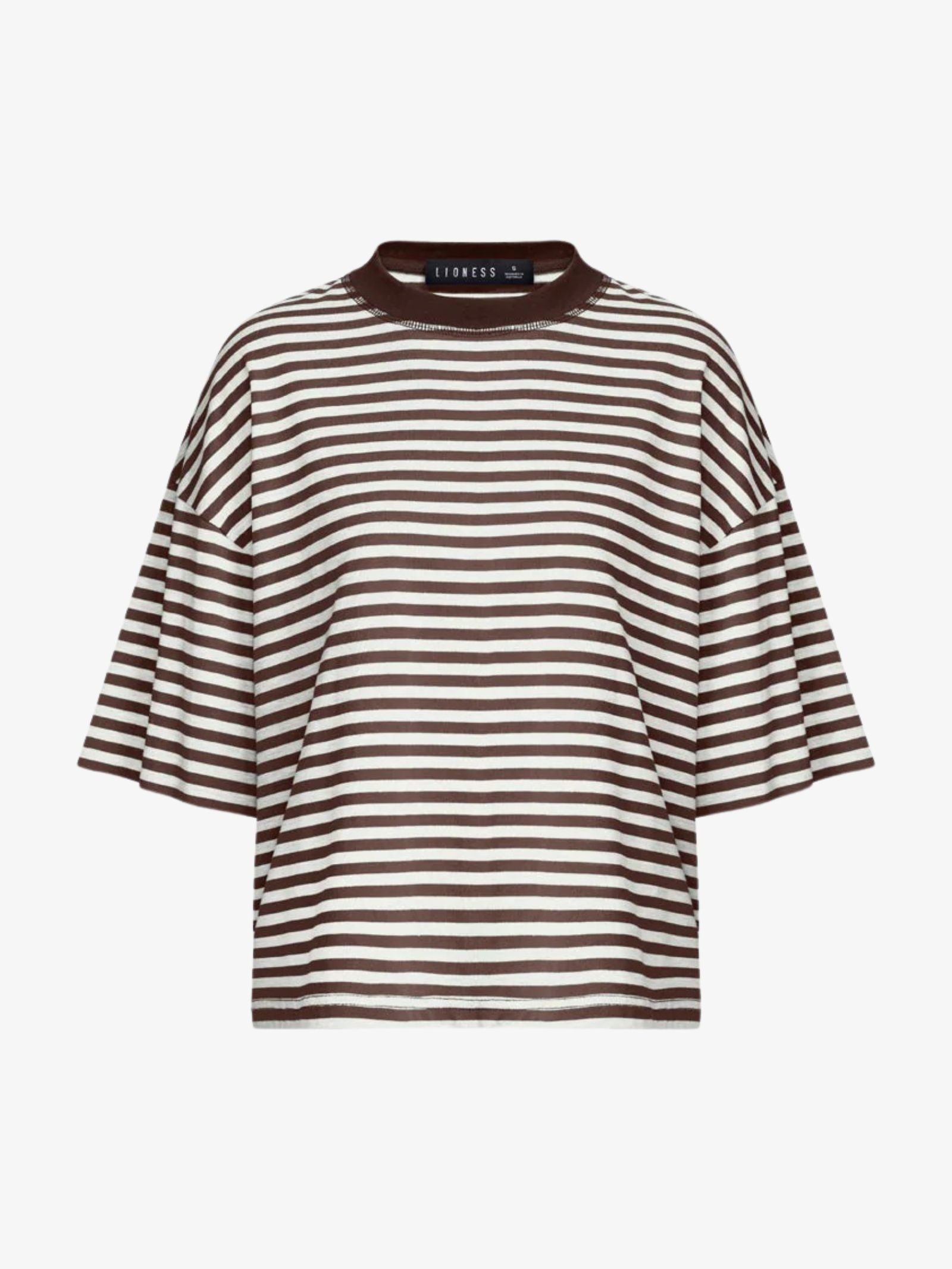This Bloom Short Sleeve Tee from Lioness is cut with a boxy, oversized fit. It features a crew neckline, short sleeves, and an all-over horizontal stripe pattern.