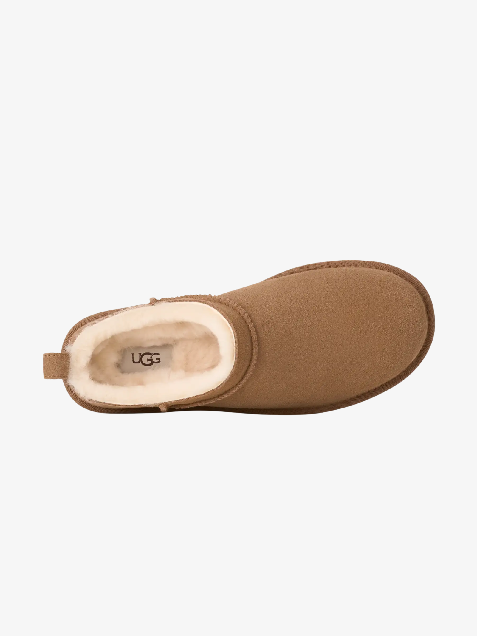 The Classic Micro in Chestnut by UGG is crafted from premium suede and lined with ultra-soft sheepskin. This pair features a lightweight sugarcane EVA outsole and is built for both indoors and out.