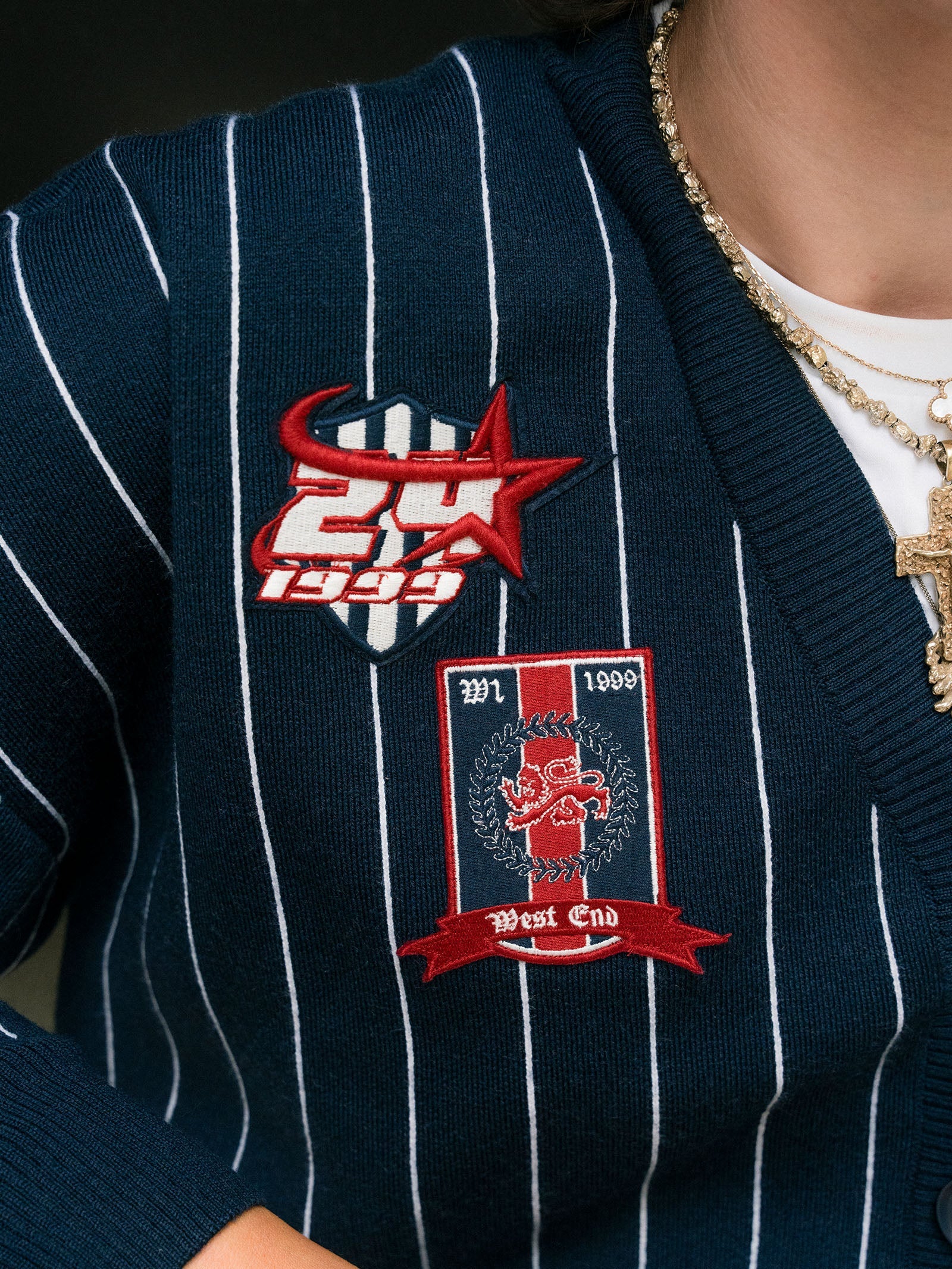 The Dean Cardigan by Lissy Roddy x Ksubi brings a bold varsity aesthetic to a classic silhouette. Crafted in a deep navy knit with white pinstripes, this button-up cardigan features collegiate-inspired embroidered patches and logos, dropped shoulders, and a relaxed fit for everyday wear with attitude.