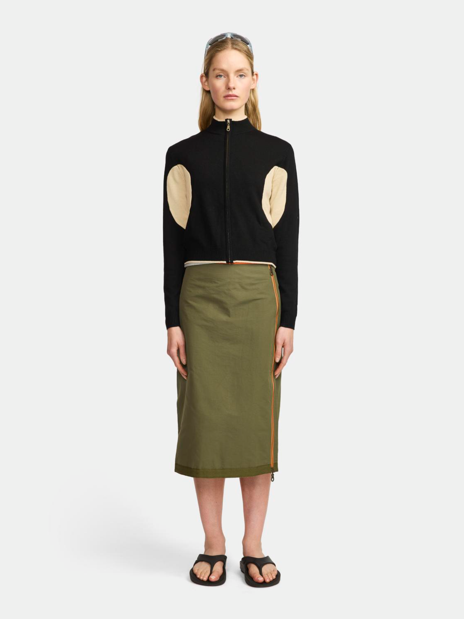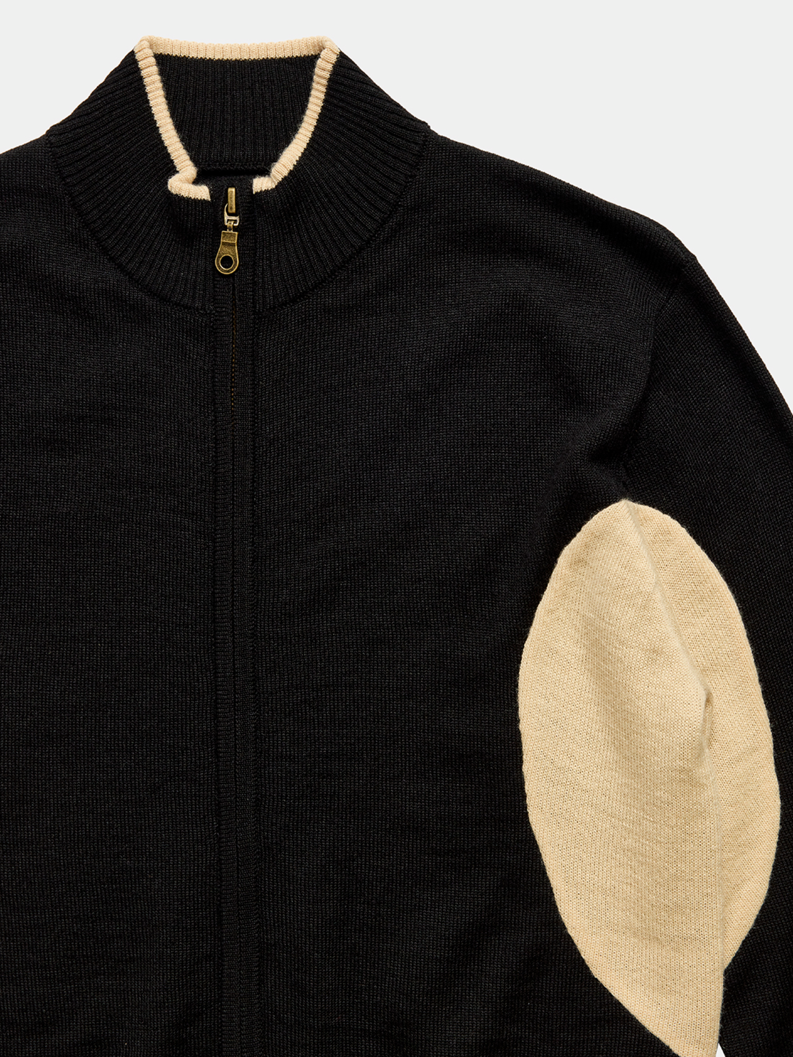 This Gains Knit by Larriet is made in a wool-acrylic blend with ribbed cuffs, hem, and collar. A contrast underarm gusset and stripe trim bring subtle detail.