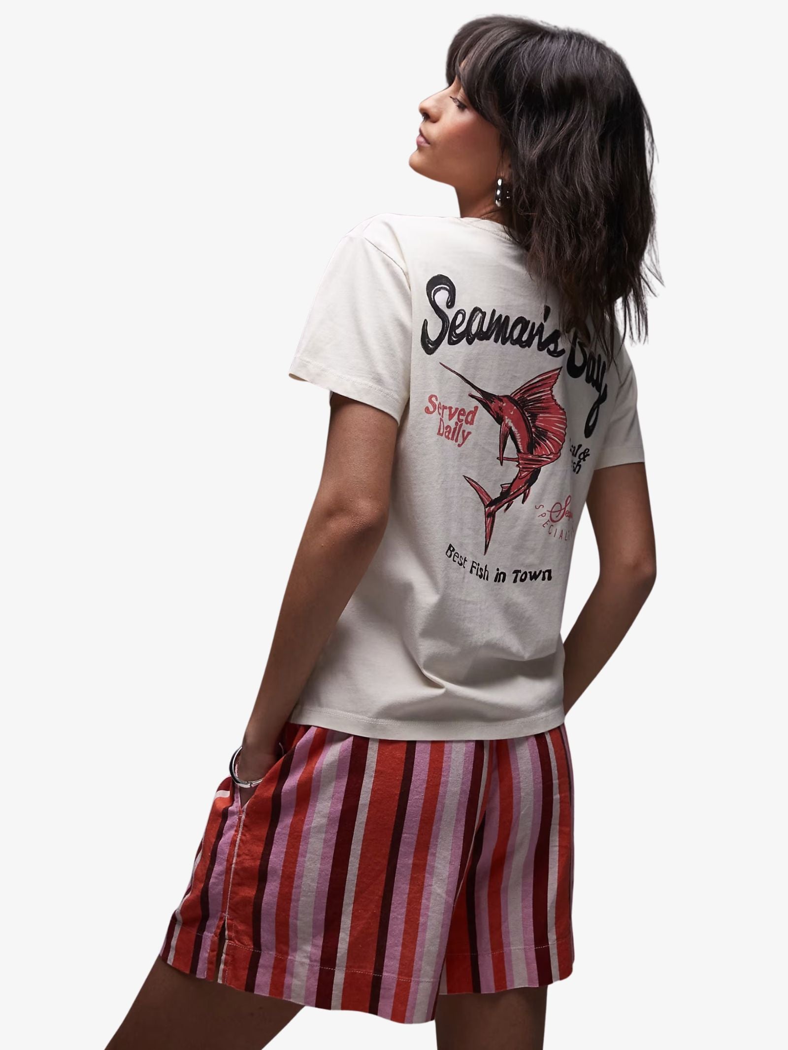 The Graphic Seamans Bay Tee by Topshop features a relaxed boxy cut with chest and back prints. Built in soft cotton jersey with crew neck and short sleeves.