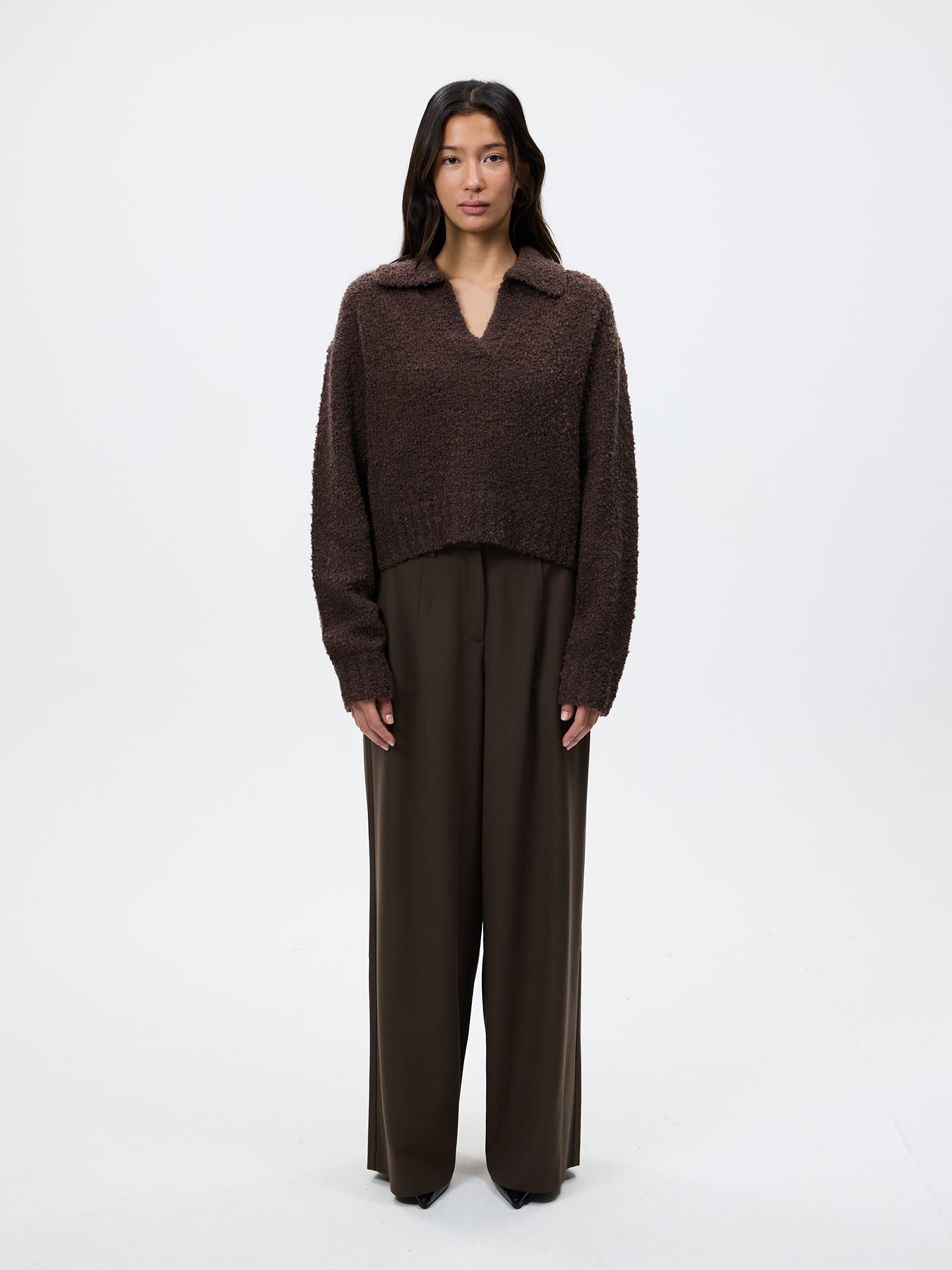 The Iggy Pant in Fawn by Lulu & Rose is designed with a high-rise waist and wide-leg silhouette. These pants offer a relaxed fit with a structured waistband and pleat detailing.