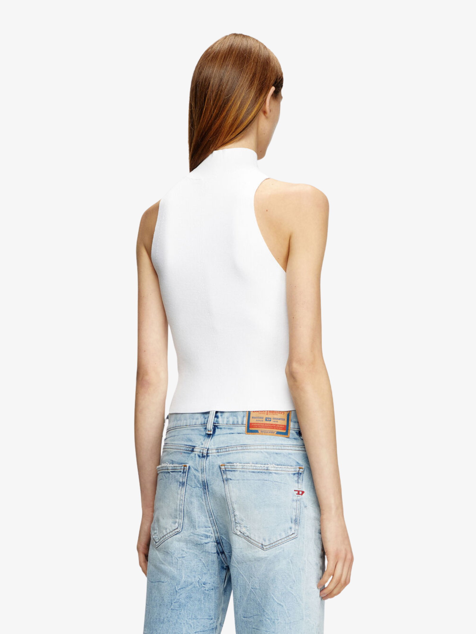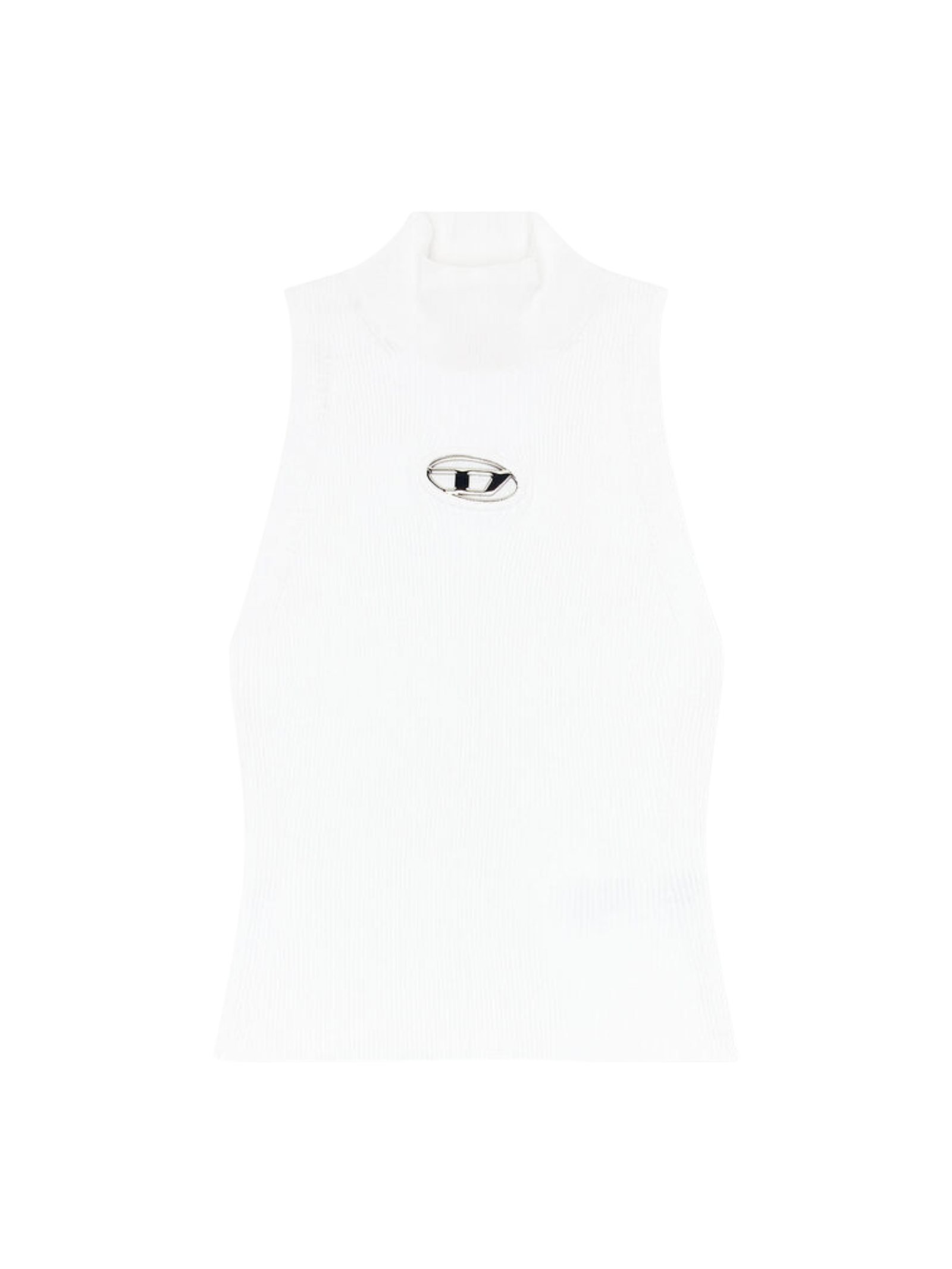 The M-Onervax Top in White by Diesel is crafted from a flexible ribbed knit. This top features a high neckline, cropped hem and a bold chest cut-out showcases a metal Oval D plaque.