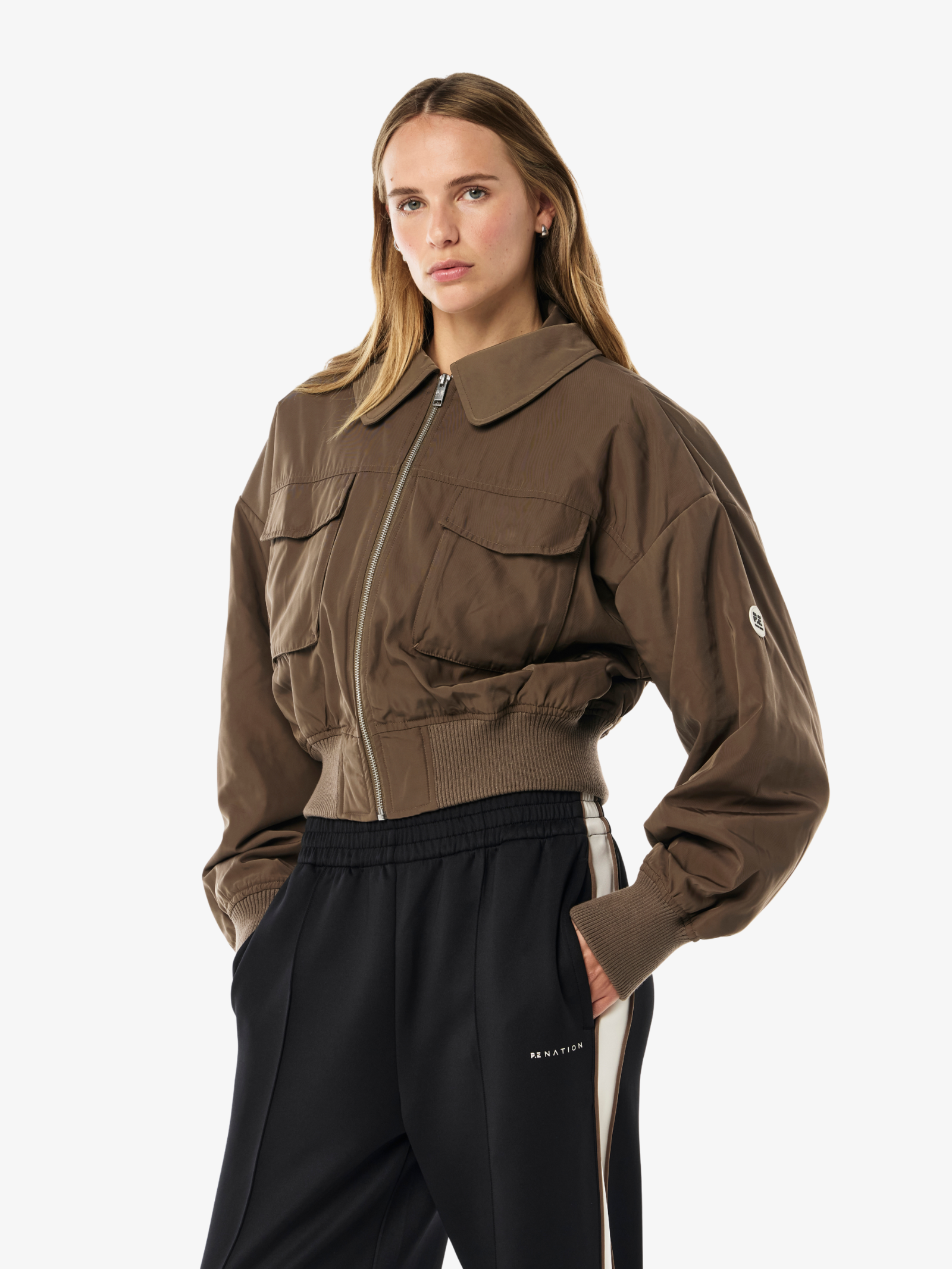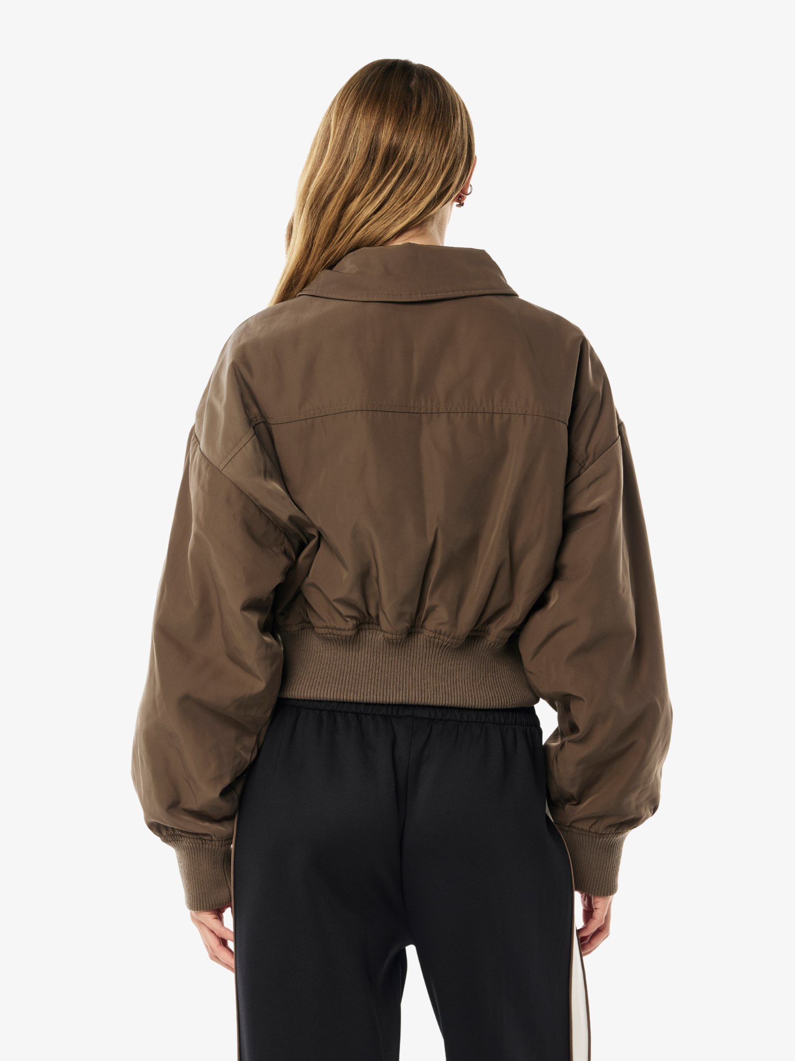 The Pursuit Bomber in Walnut by P.E Nation is crafted from lightweight spray twill and lightly wadded in the body and sleeves. This jacket is finished with ribbed cuffs and hem, a structured collar, and discreet chest pocket snaps.