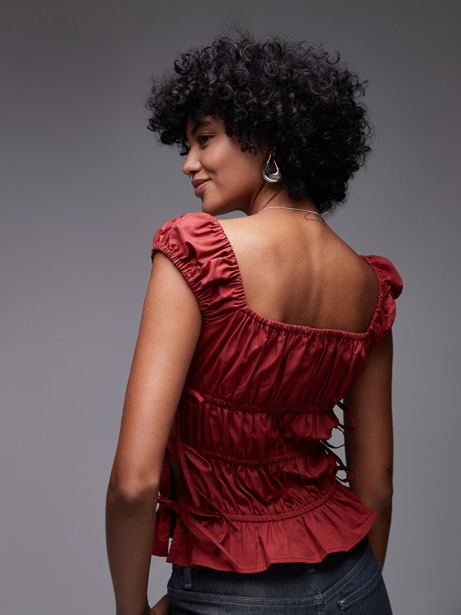 This Ruched Tiered Tie Side Top by Topshop is designed with a square neckline, cap sleeves, and intricate ruched detailing for texture and shape. The tie sides add an adjustable element, while the regular fit makes it versatile for layering or wearing on its own.