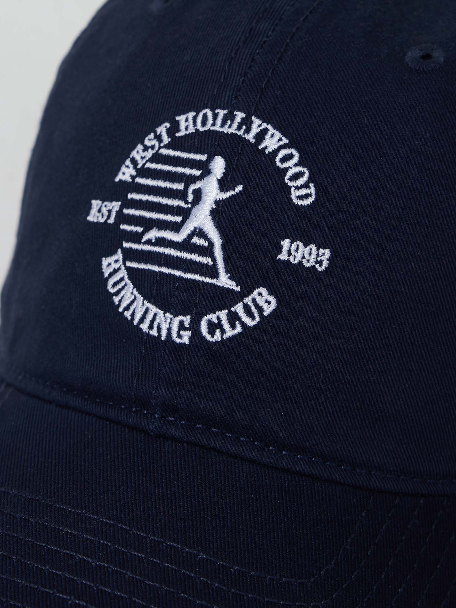 The Running Club Ball Park Cap by West Hollywood Sweat Club features embroidered artwork on the crown. Designed with a curved brim and contrast stitching for a clean finish.