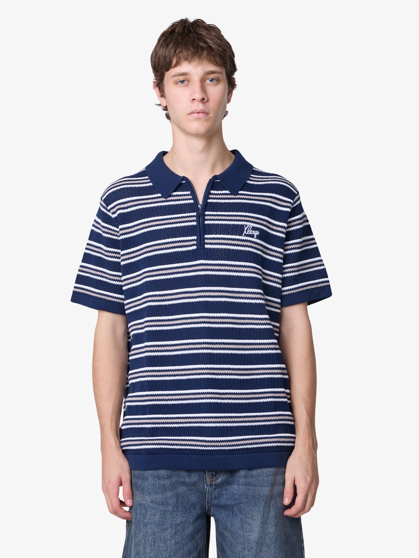 The Script Stripe Short Sleeve Polo from Xlarge is a custom box-fit polo, constructed from a combination mesh knit and rib knit.