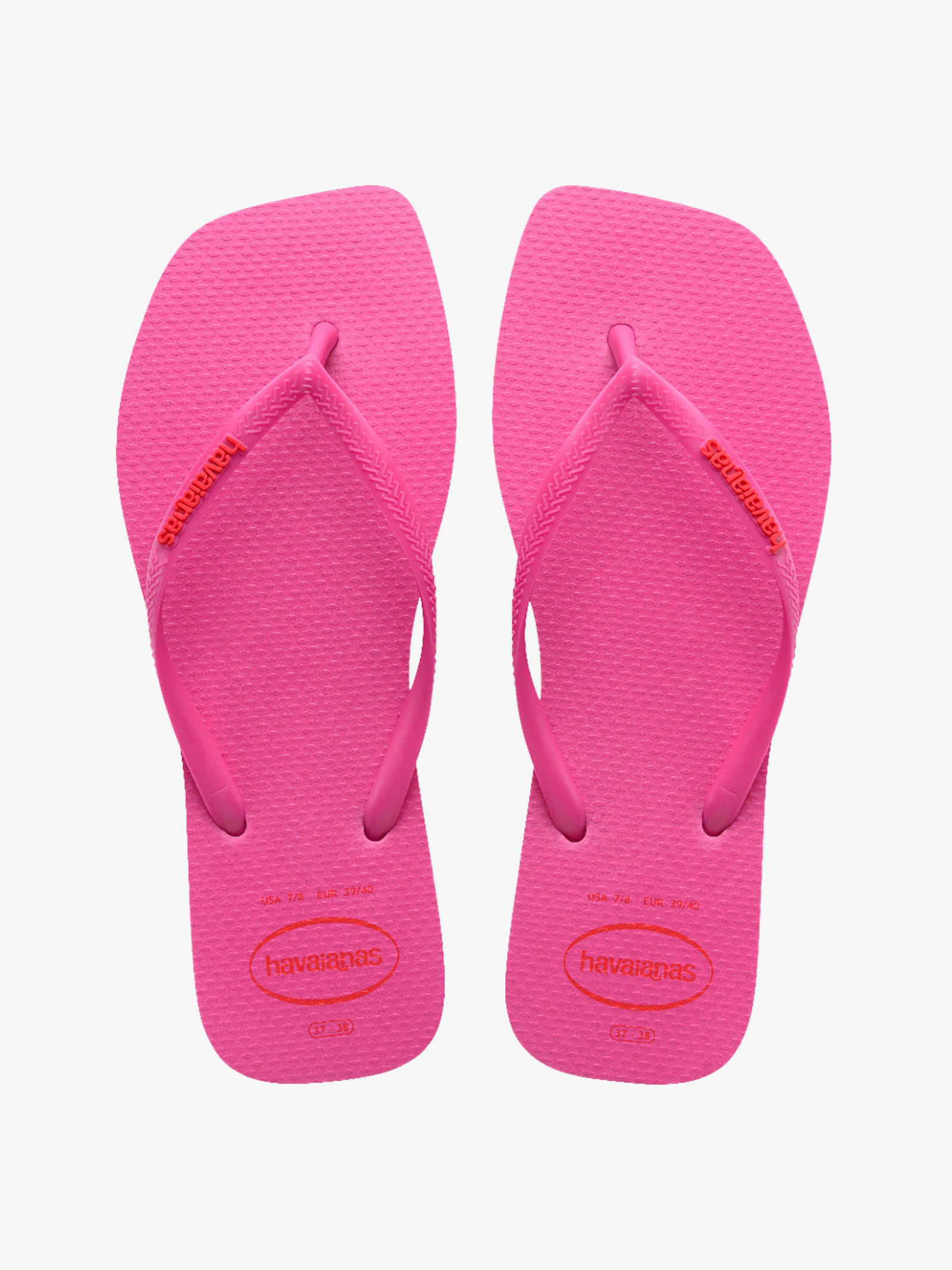The Slim Square Pop Up in Pink Flux by Havaianas is designed with a sleek square-toe silhouette. This flip flop features a soft footbed, and a pop-up logo.