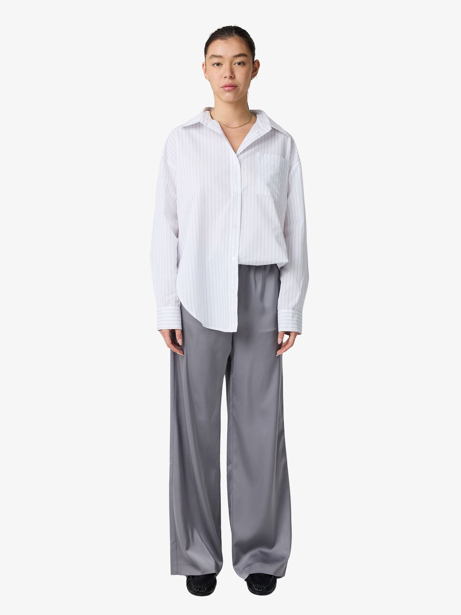 The Stripe Shirt by MSE is tailored in a lightweight cotton blend with a relaxed fit. Featuring a pointed collar, button front, and chest pocket, it’s a versatile wardrobe essential.