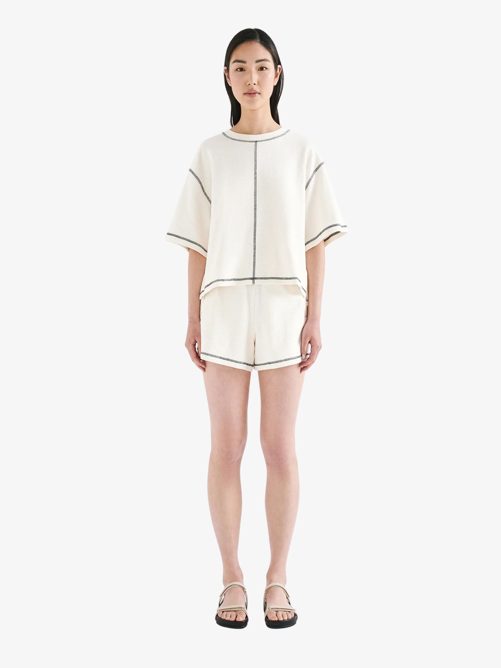 The Sutton Tee by Nude Lucy is cut in a boxy silhouette with short, wide sleeves. Crafted from textured cotton, it features a crew neckline and stepped hem with side slits.