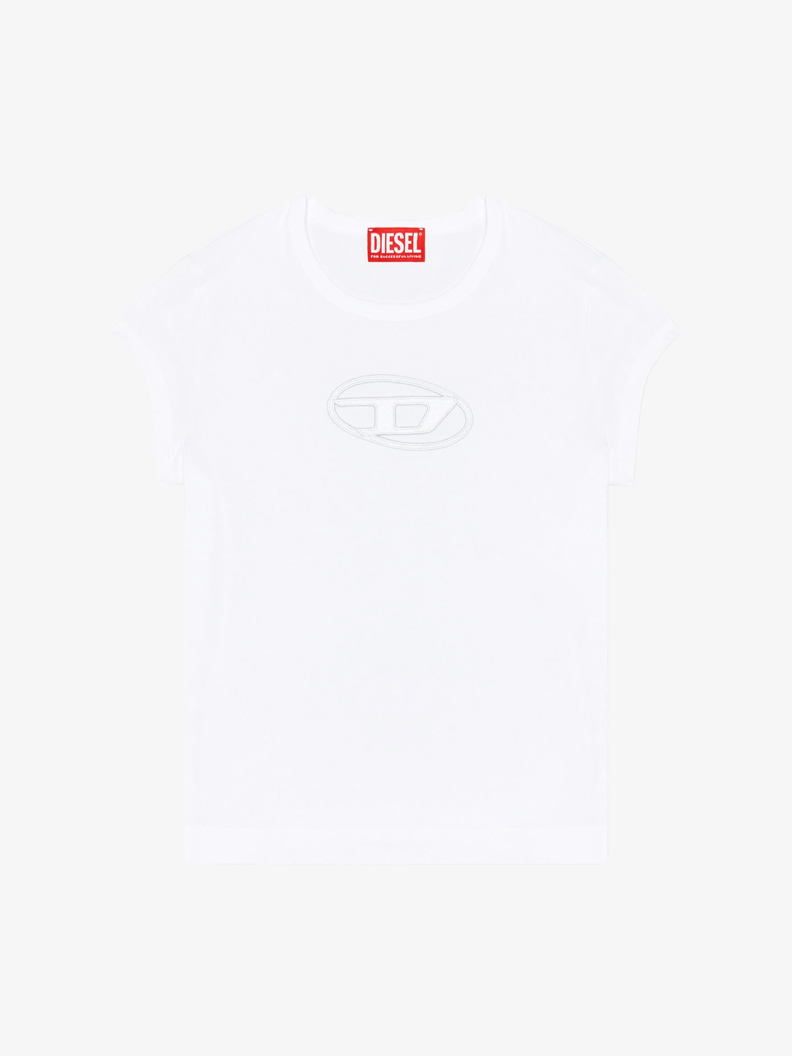 The T-Angie in White by Diesel is crafted from soft organic cotton with added stretch.. This tee features a laser-cut peekaboo ‘oval D’ logo on the chest, and is outlined with embroidery.