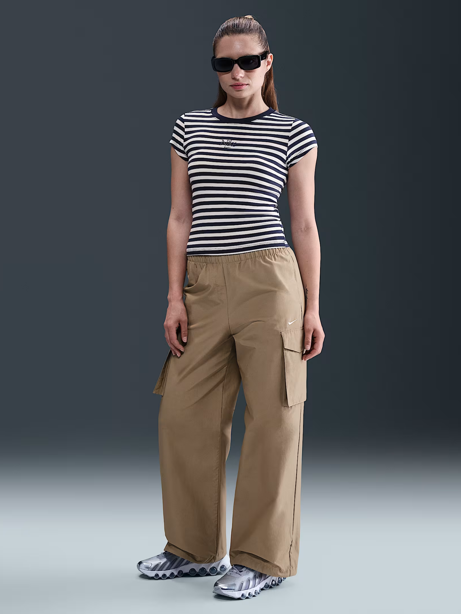 The Nike Sportswear Women's Tight Striped T-Shirt combines style and comfort with its sleek, snug fit. Featuring printed graphics for a bold, sporty look, this tee is made with soft fabric for all-day comfort. Perfect for a modern, casual style, it adds a unique touch to your wardrobe.