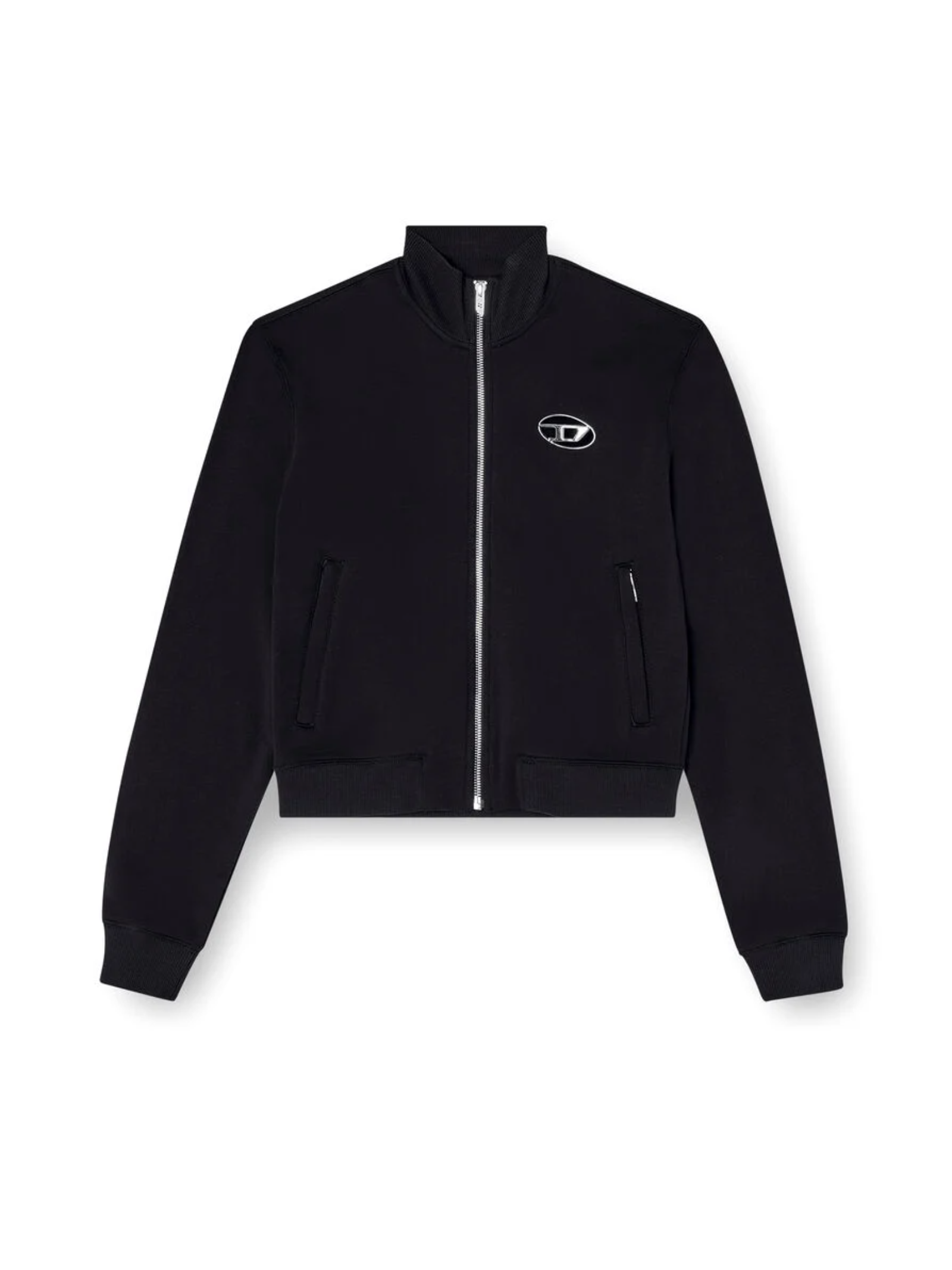 The Women's F-Flacin Sweatshirt by Diesel is a regular fit zipped sweatshirt made from organic cotton. It features a ribbed high neck, cuffs and hem, two pockets, and a metal-look Oval D logo with peekaboo cut-outs.