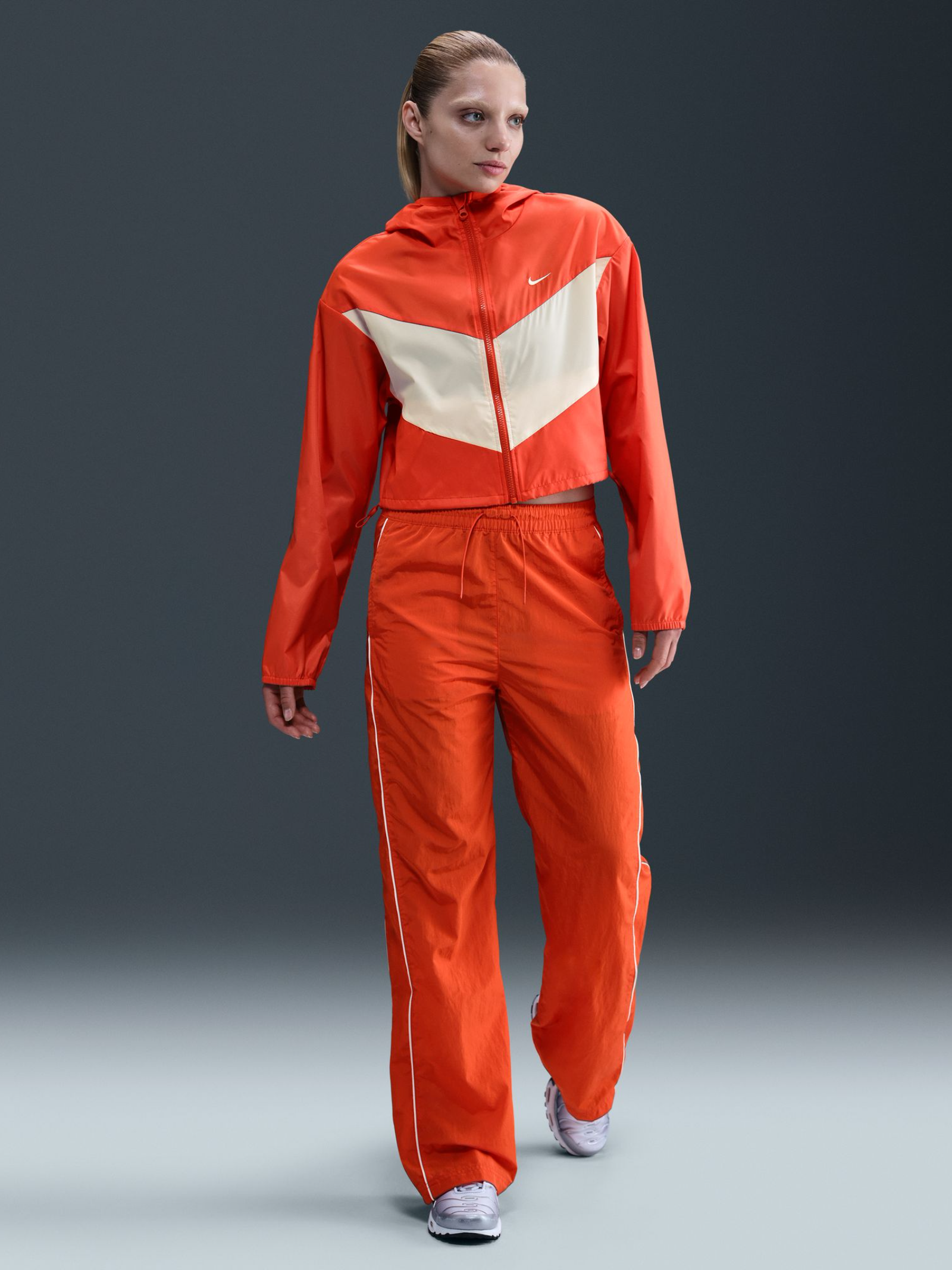 The Women's Loose Woven Hooded Jacket by Nike is crafted in lightweight micro-ripstop for durability and ease. Dropped shoulders and a cropped length create a roomy fit, finished with bungee adjustments at the hem.