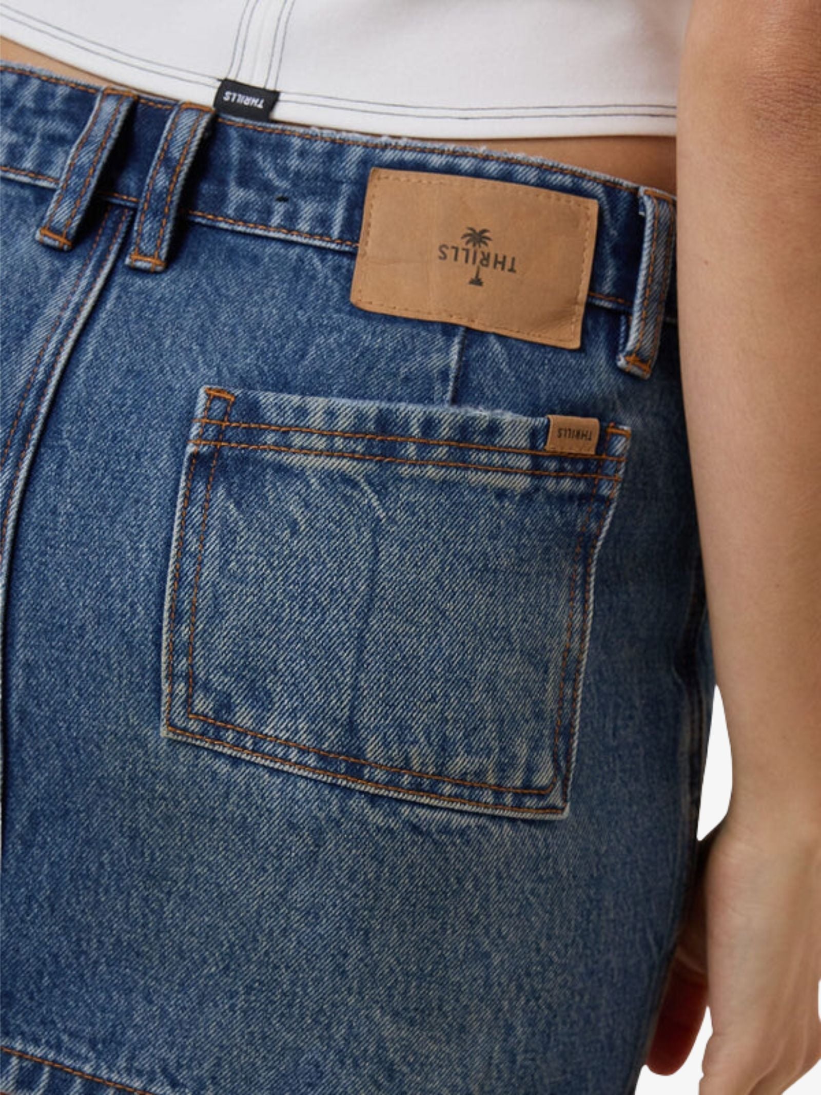 The Wyatt Skirt from Thrills is cut from heavyweight denim with a mid-rise waist and a regular fit. It features a clean hem, multiple pockets, a faded vintage wash, and a double-button side closure.